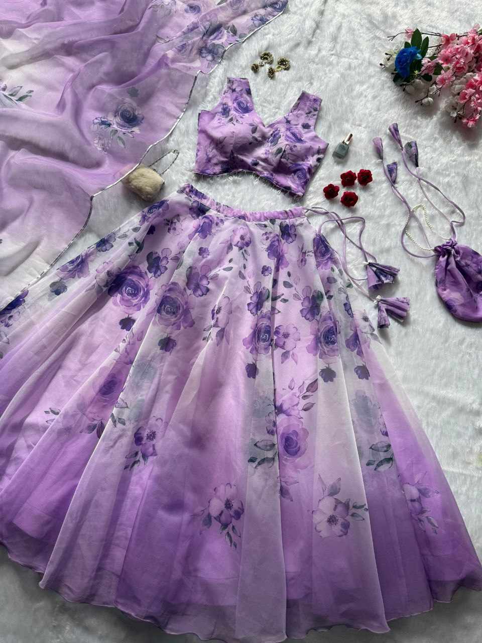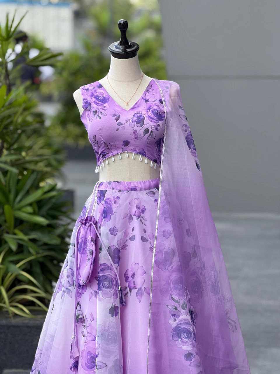 Lehenga – Pure organza silk digital printed lehenga with a grand 8-meter flair. Finished with canvas patta for a perfect flare